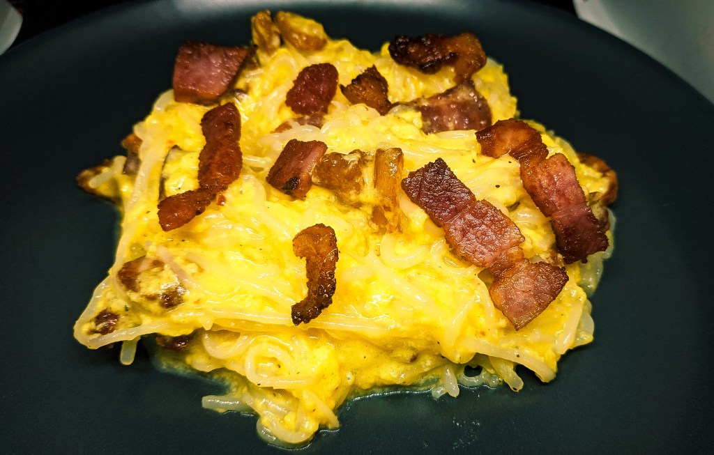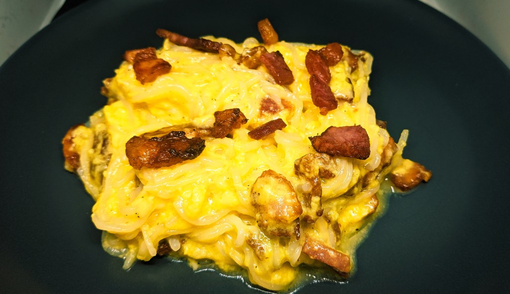Do podsmażonego boczku dodajemy makaron i chwilę podsmażamy.