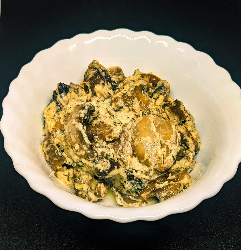 Smażymy grzyby do miękkości i dodajemy przeciśnięty przez prackę czosnek oraz koperek.