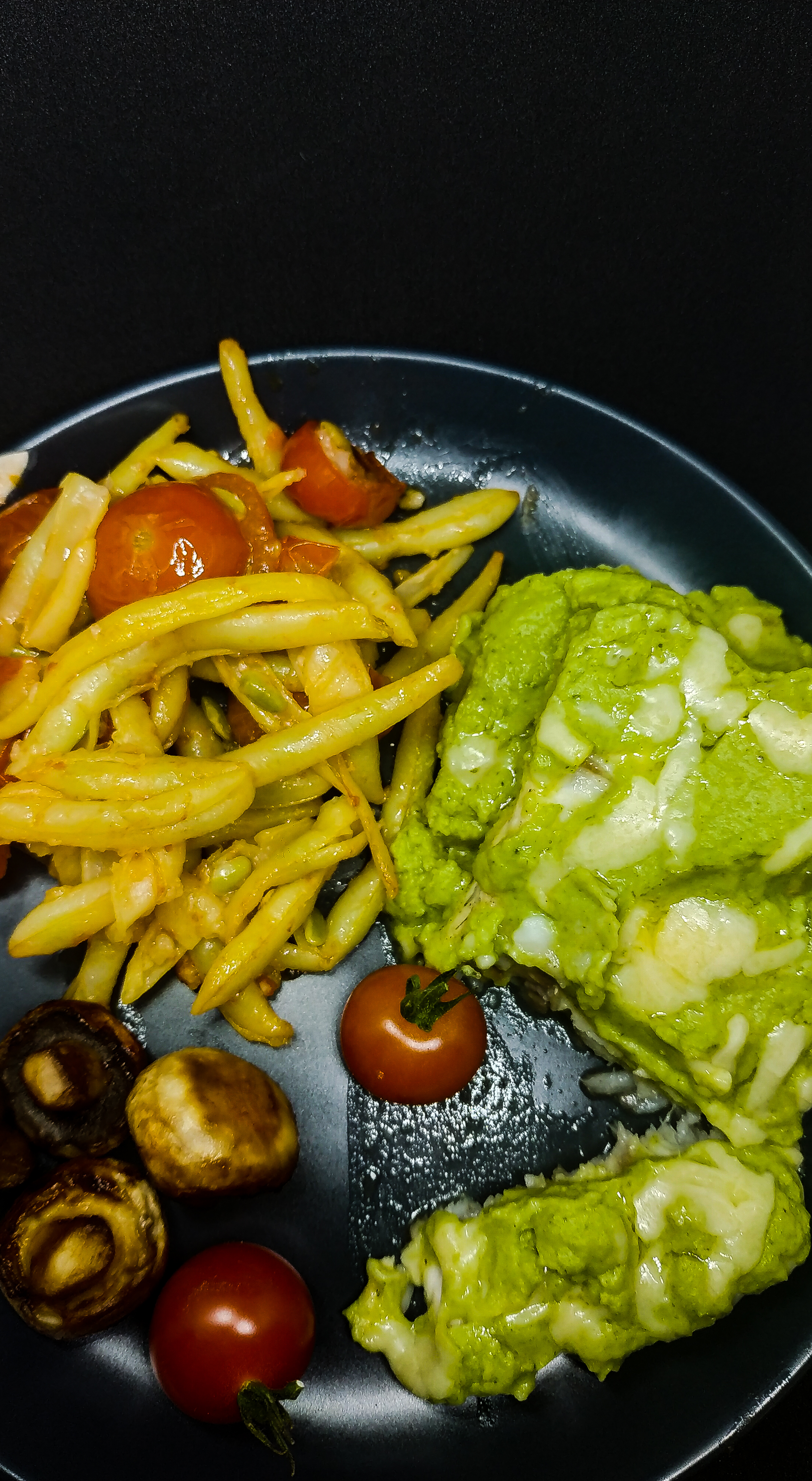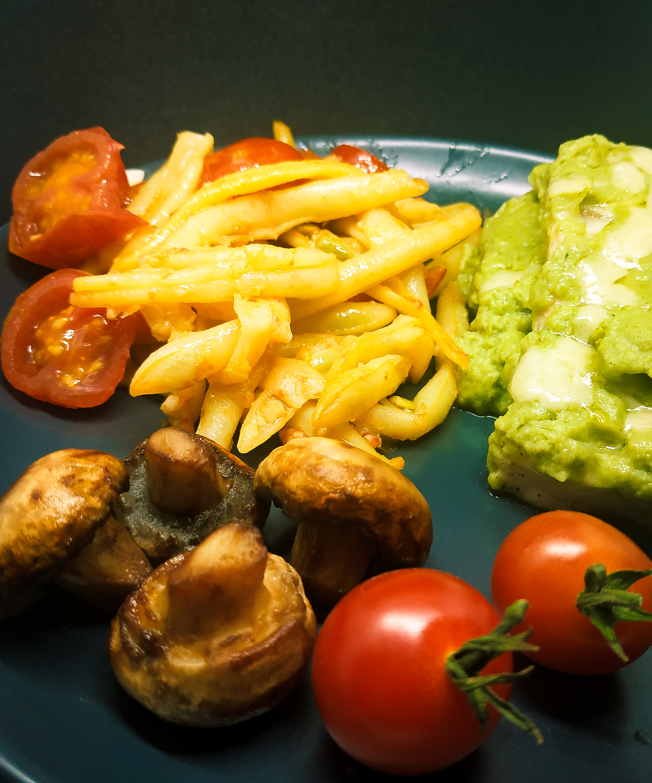 Fasolkę gotujemy do miękkości, pomidory wraz z czosnkiem (3g) smażymy na maśle ( 20g), po 5 min dodajemy fasolkę i przyprawiamy. Smażymy całość 5 minut.