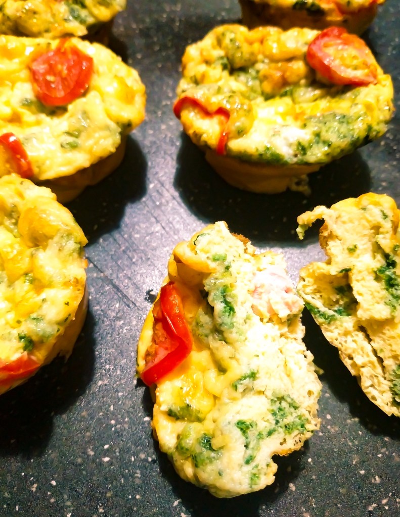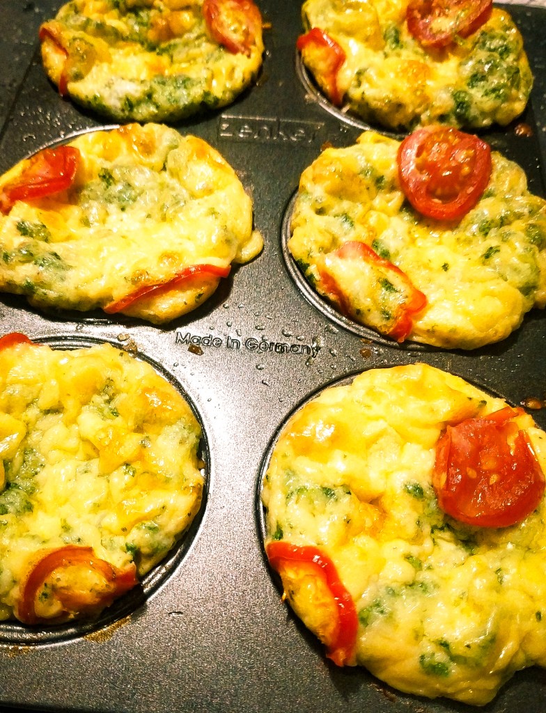 Blachę smarujemy olejem. Do każdego gniazda wkładamy równe ilości składników, wszystko zalewamy jajaeczną masą- lekko mieszamy w gniazdach. Posypujemy serem.