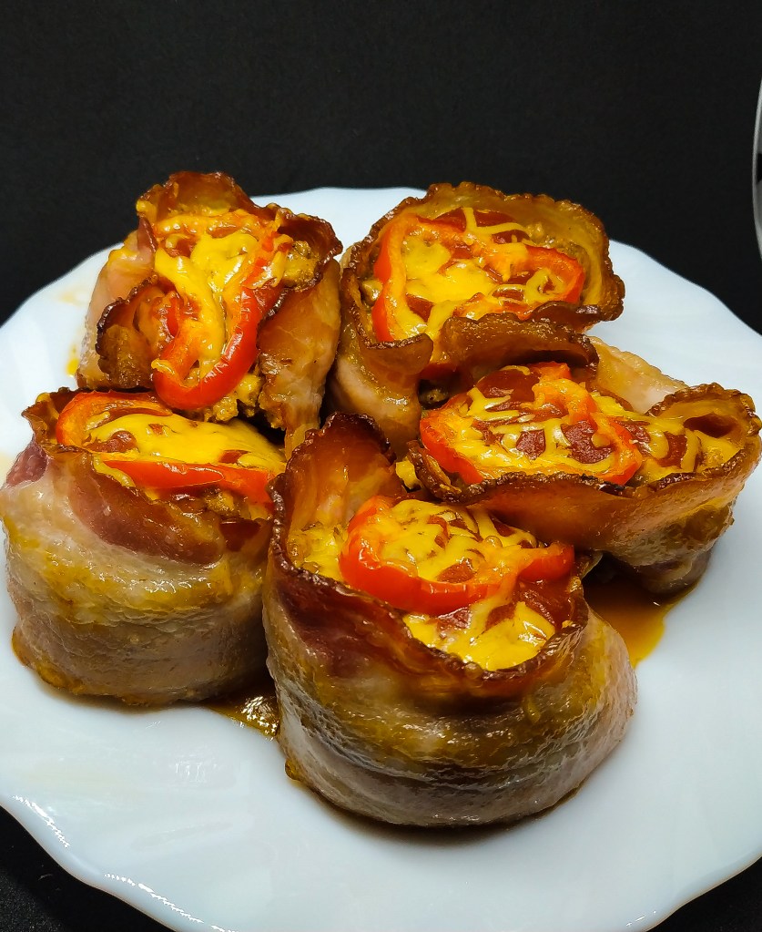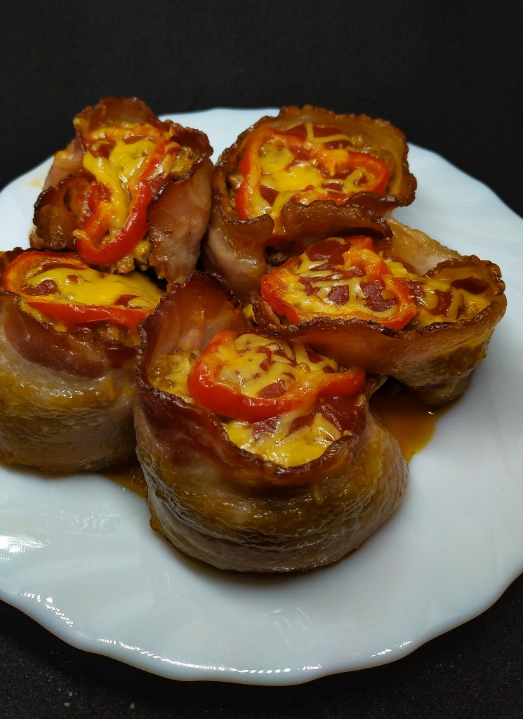 Blachę na muffinki smarujemy olejem i obwijamy gniazda boczkiem, resztę plastrów układamy na dnie.