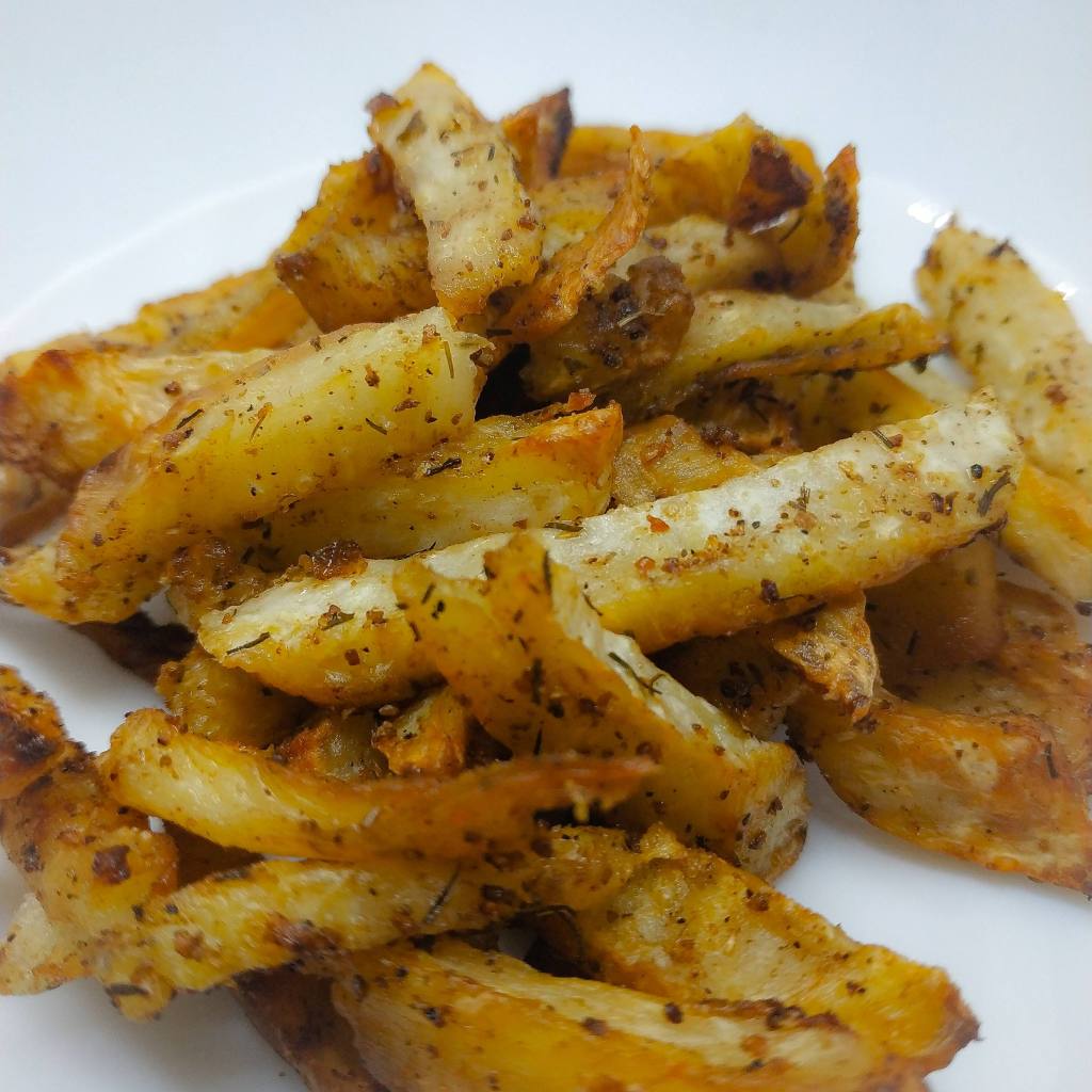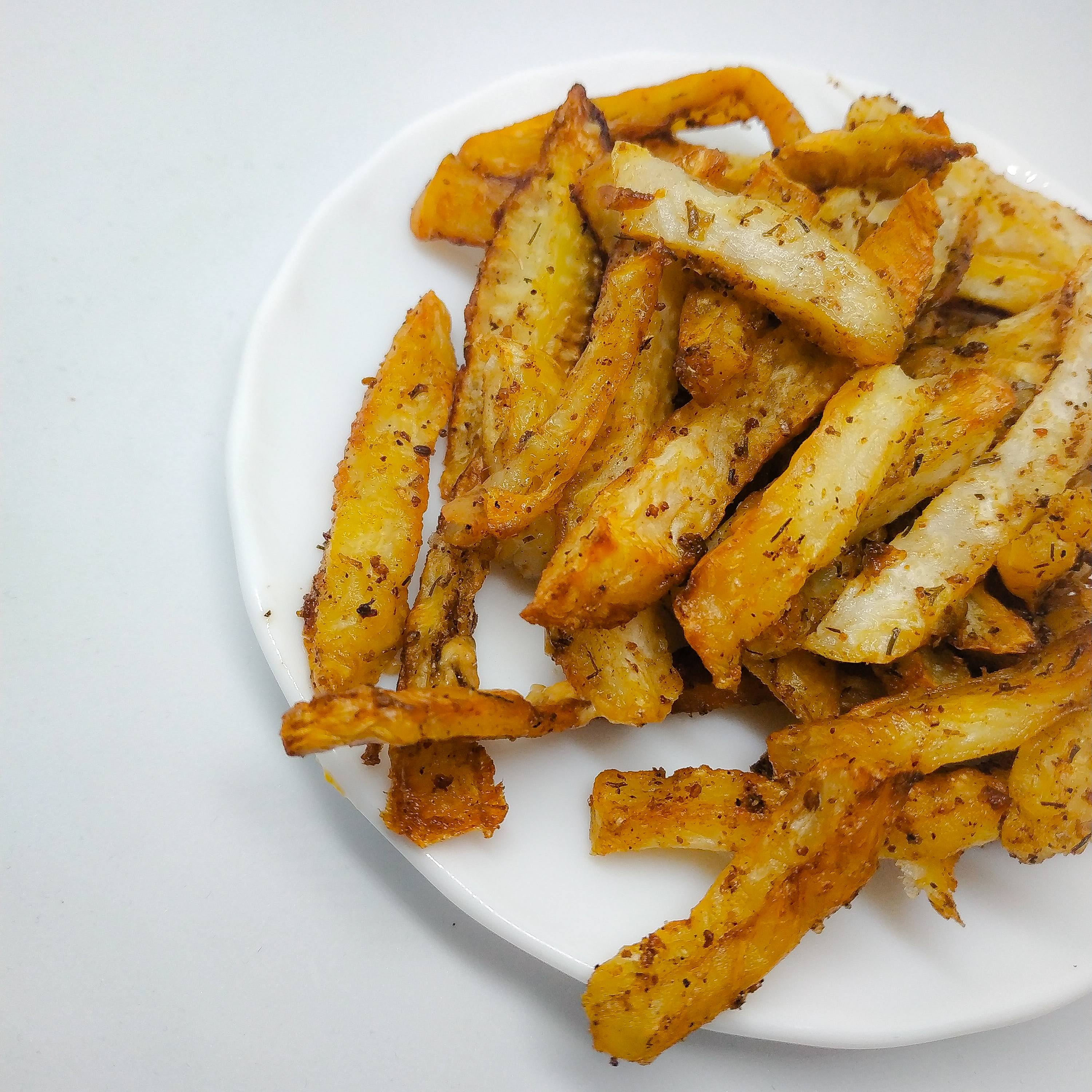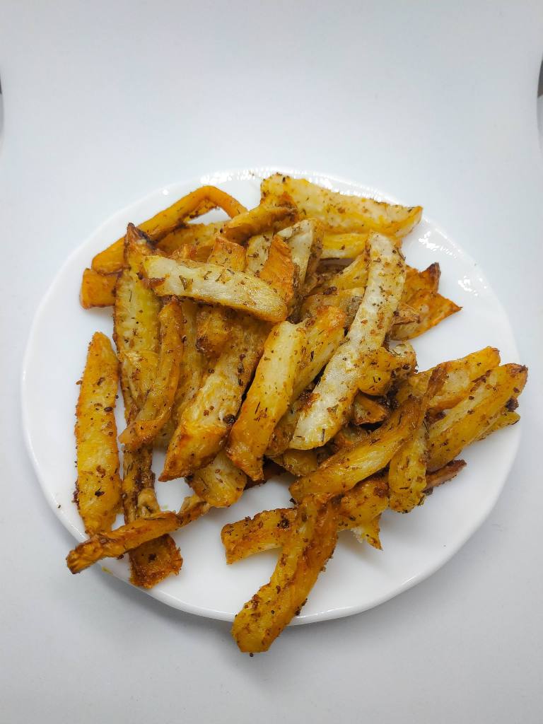 Olej rozgrzewamy, dodajemy „frytki”, solimy i doprawiamy ulubionymi przyprawami.