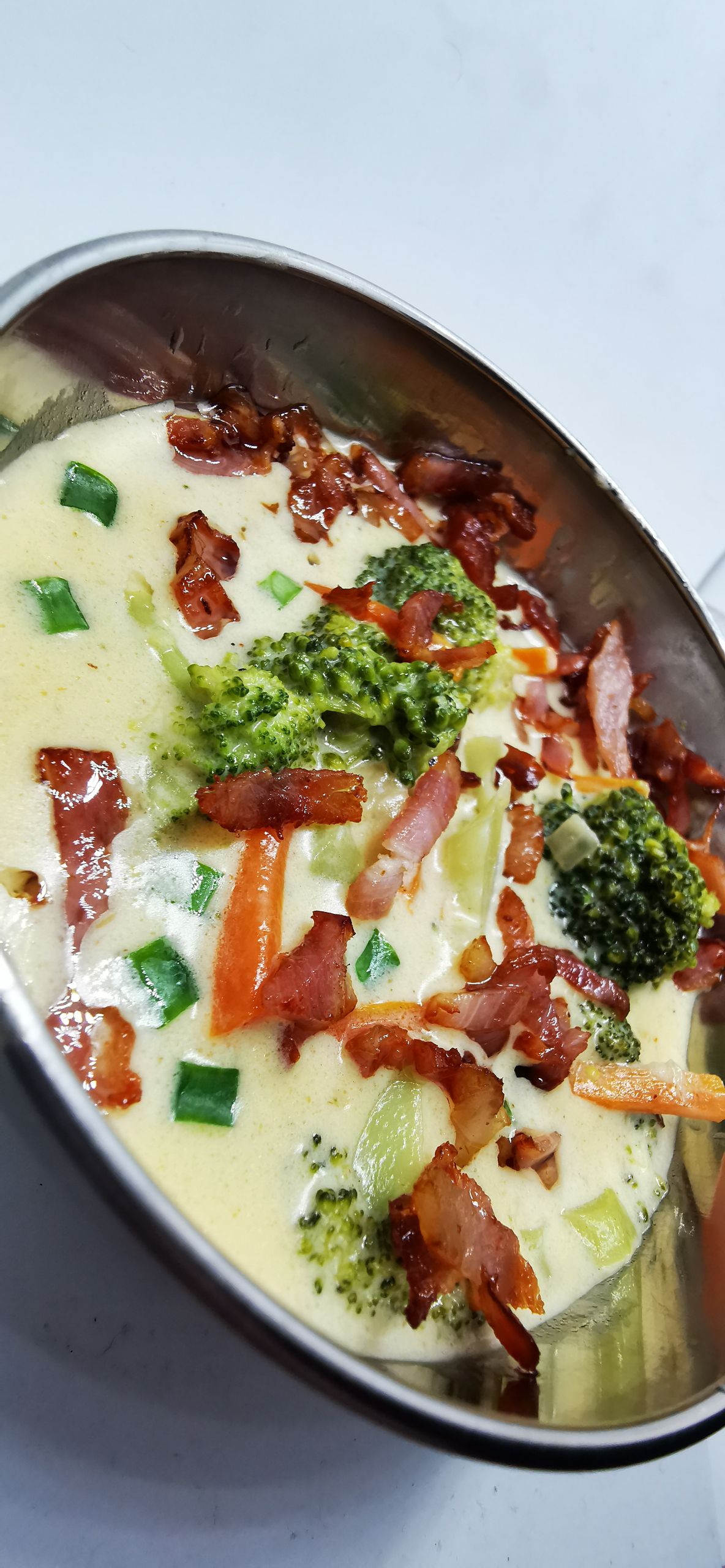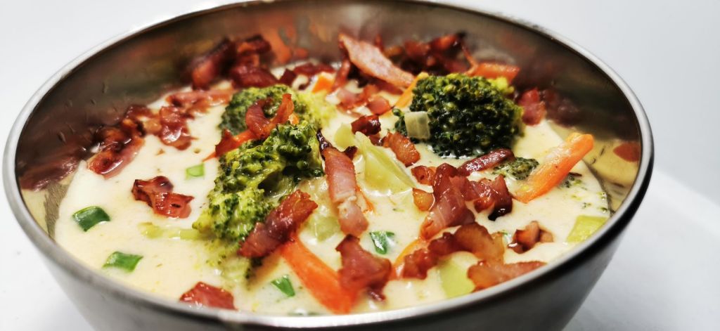W gorącym bulionie mieszamy śmietanę i dodajemy do garnka, następnie śmietanę 30% i ser śmietankowy. Ser cheddar dodajemy partiami i energicznie mieszamy. Przyprawiamy.