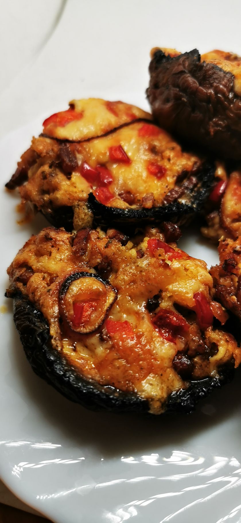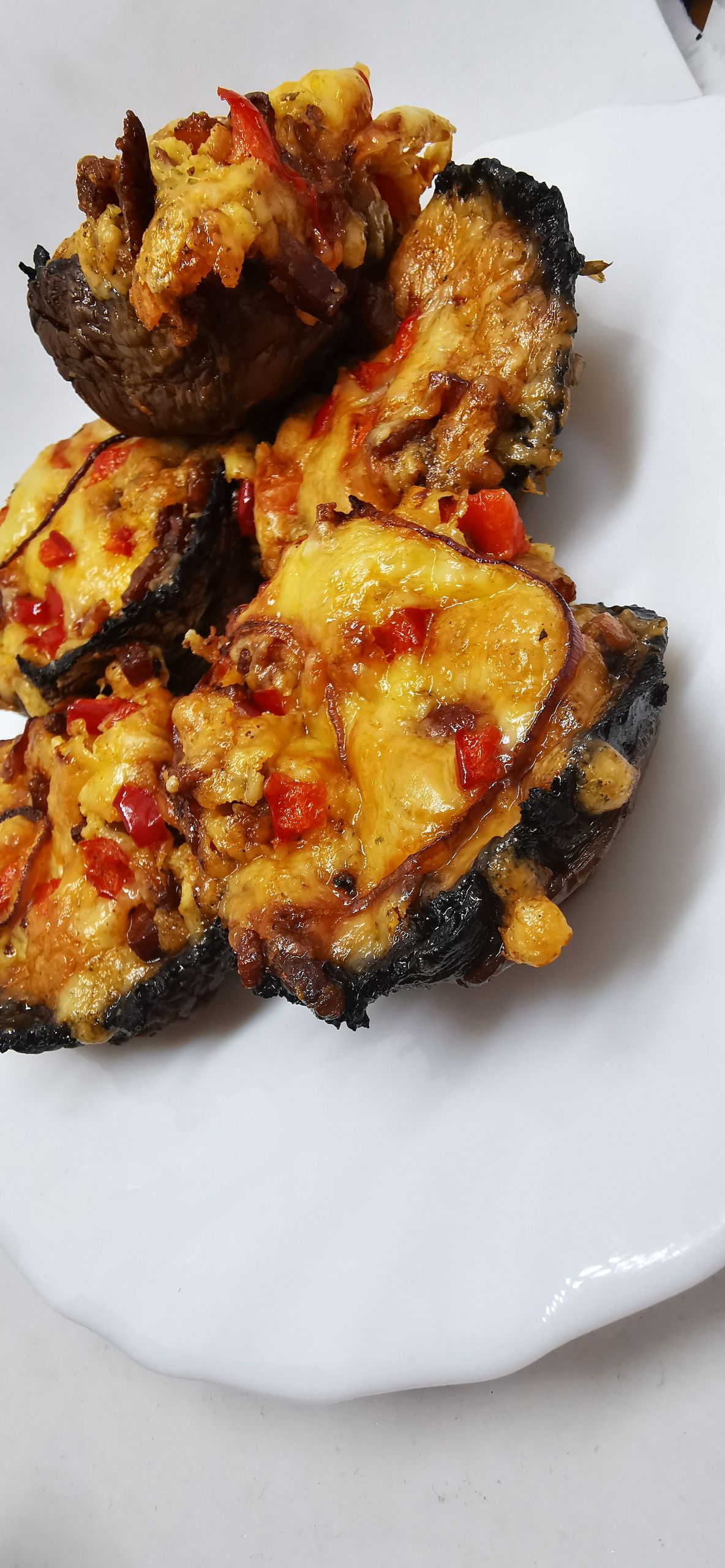 Pieczarki solimy i pieprzymy, układamy na blaszce wyłożonej papierem lub na metalowej formie do babeczek, do każdego kapelusza wlewamy trochę tłuszczu z boczku (wsiąknie), nakładamy farsz, na górę posypujemy pokrojoną w kostkę papryką.