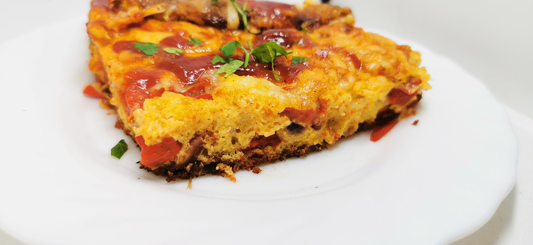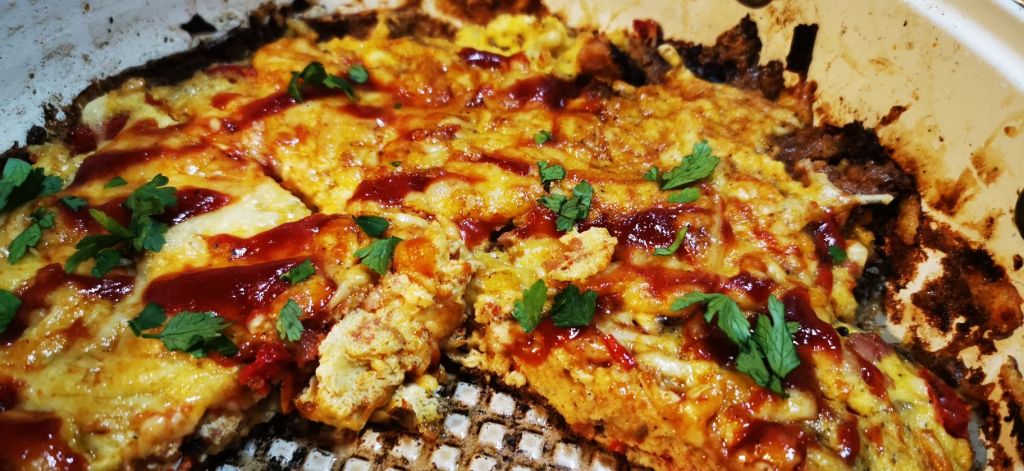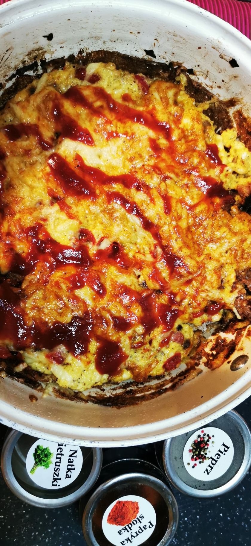 Resztę serów mieszamy z papryką słodką i majonezem. Mieszankę przekładamy na frittatę i zapiekamy w piekarniku ( 200C) przez 10 minut z dodatkiem ketchupu.