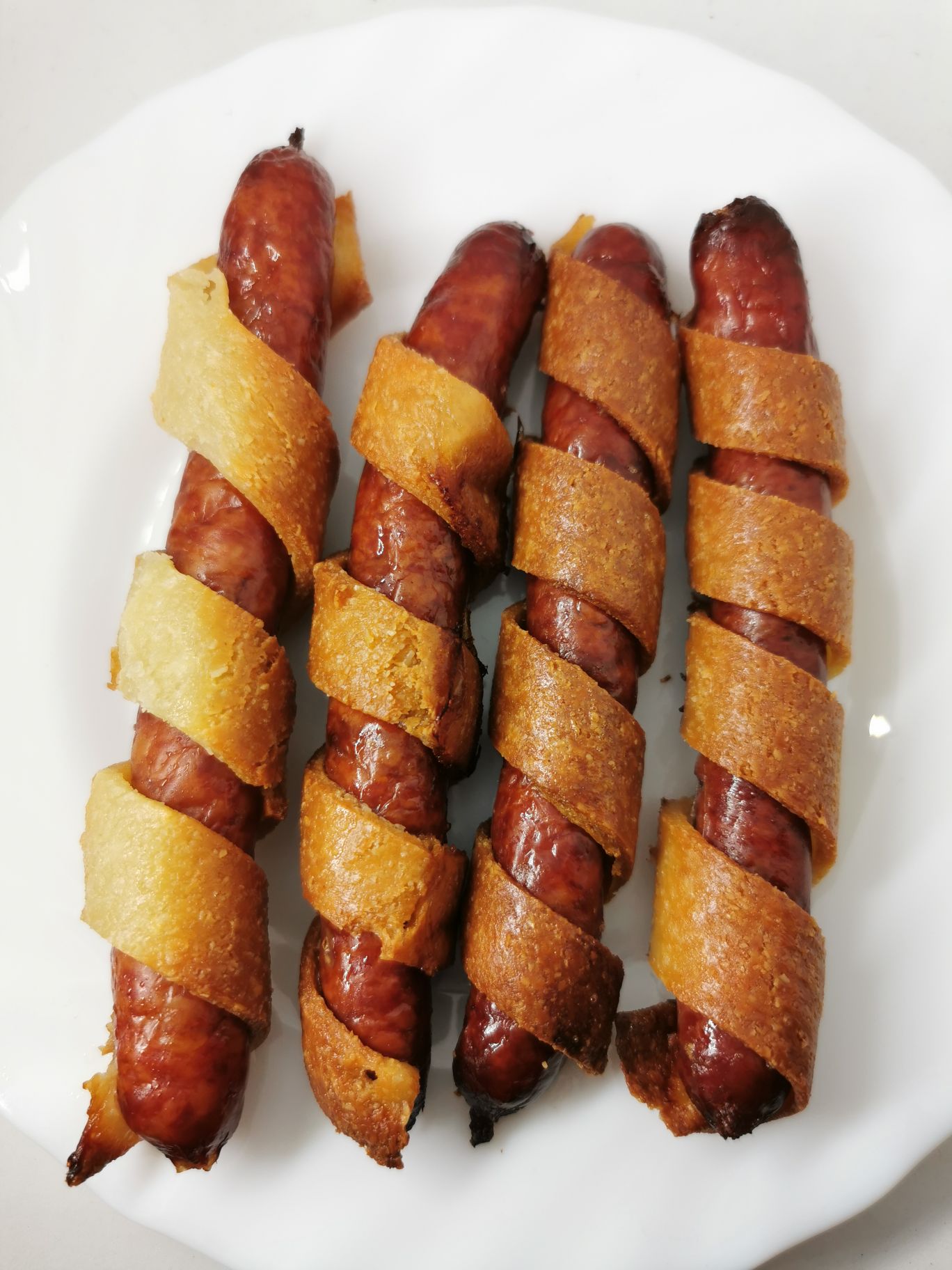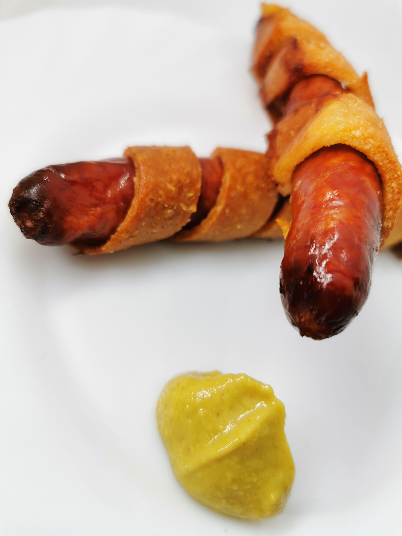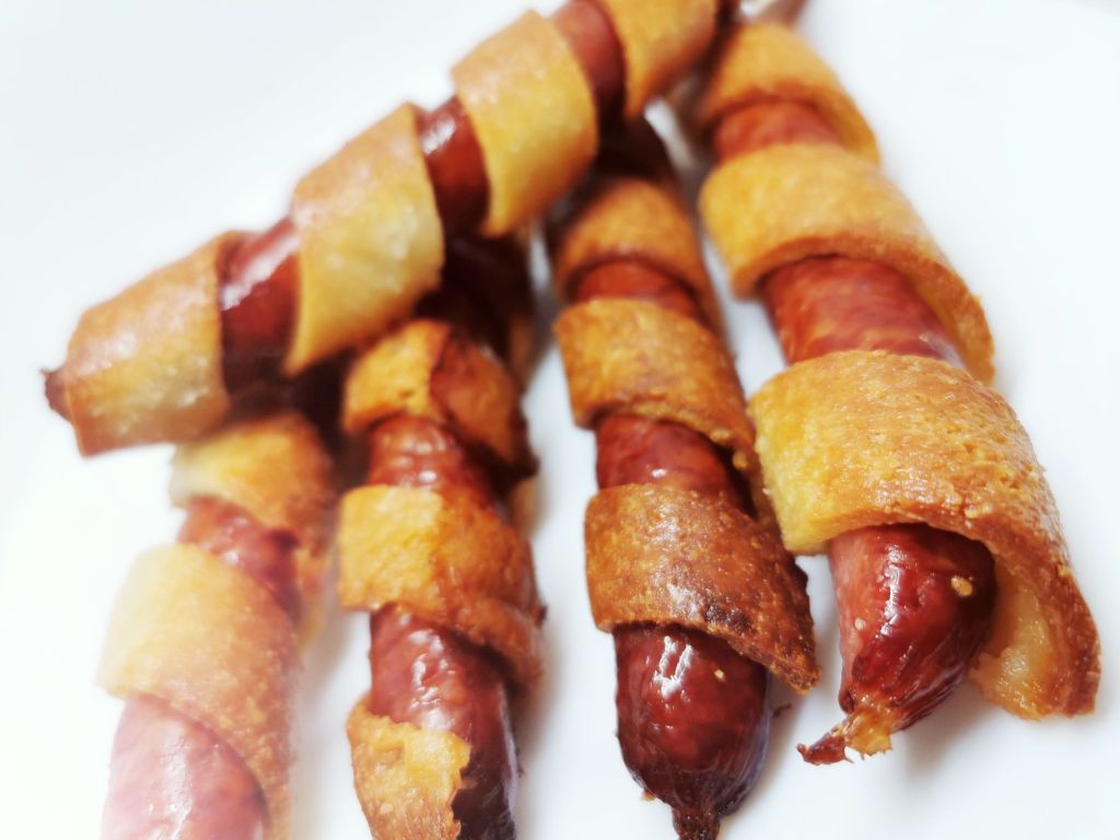 Obwijamy każdą kiełbaskę paskiem ciasta i smarujemy górę rozbełtanym jajkiem.