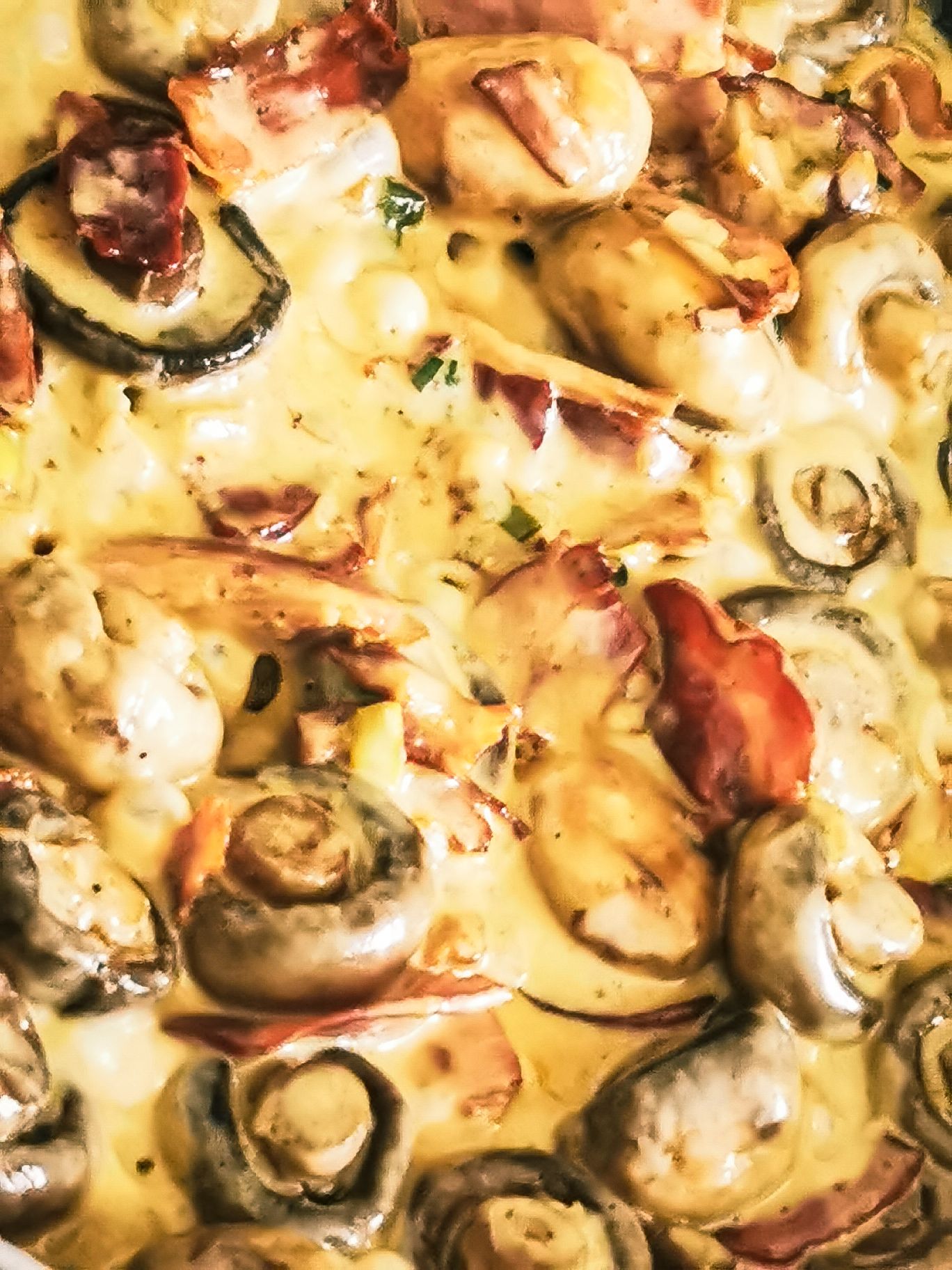 Gotować na małym ogniu do redukcji sosu i miękkości grzybów. Dodać boczek i wymieszać danie.