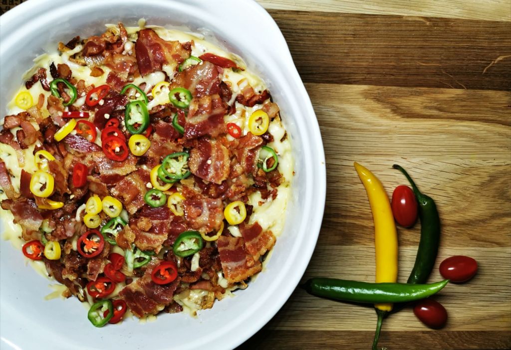 W naczyniu żaroodpornym ułożyć frytki, posmarować wierzch majonezem i posypać serem i papryczkami.