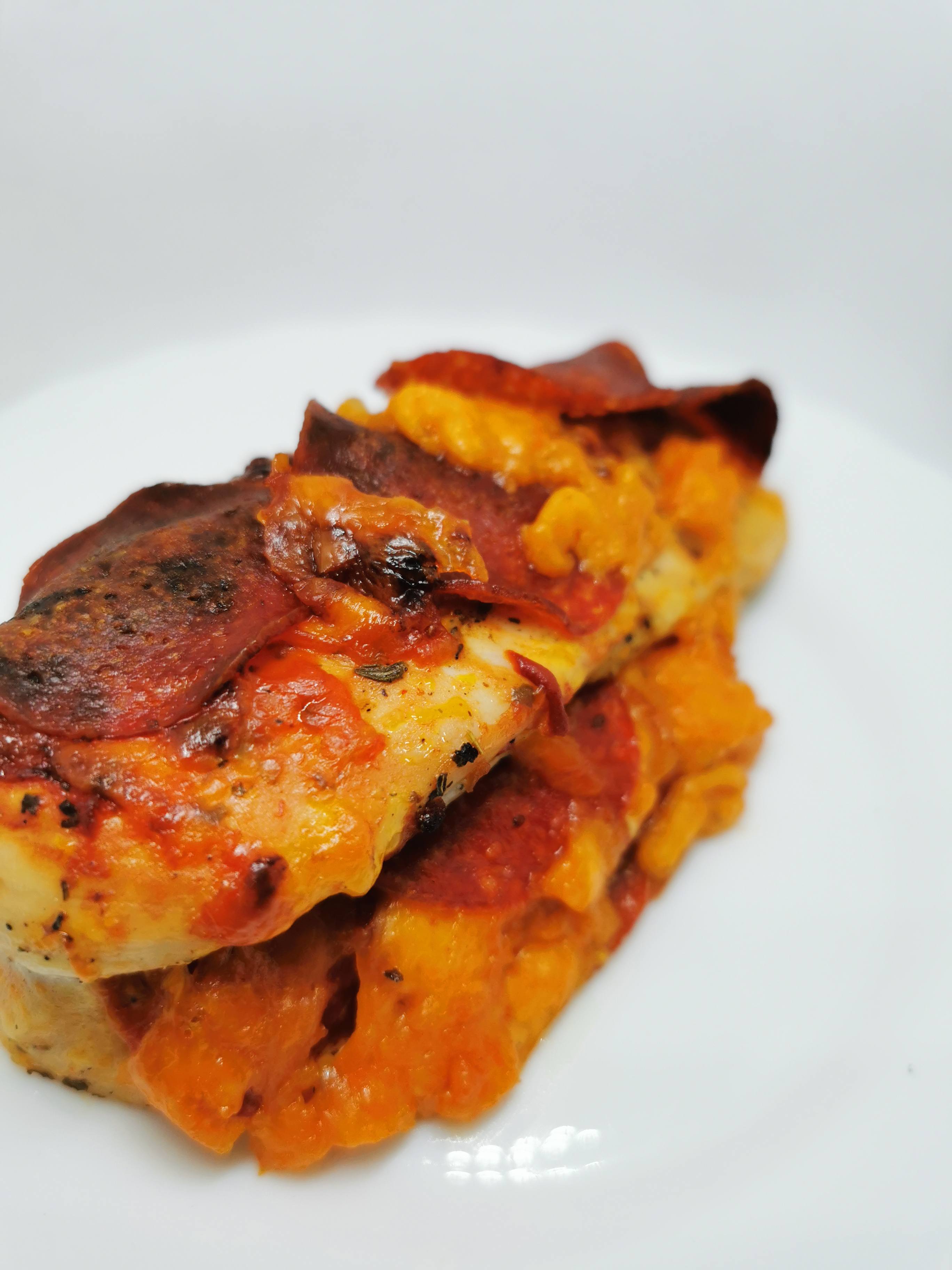 Każdy kawałek smarujemy ketchupem/ sosem zero, posypujemy serem i kładziemy po 4 sztuki salami.