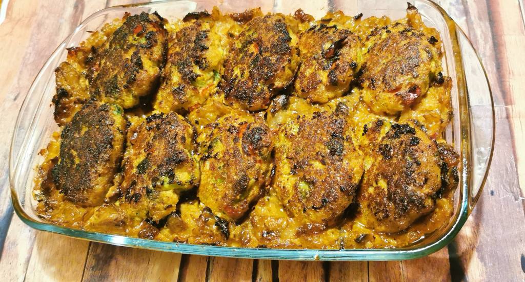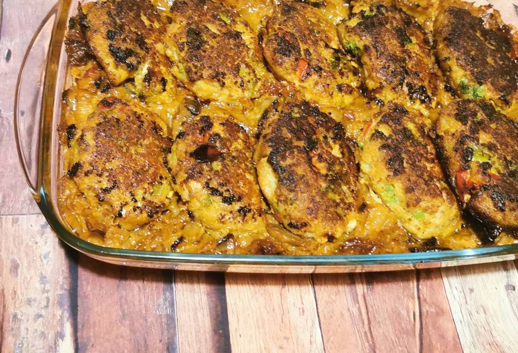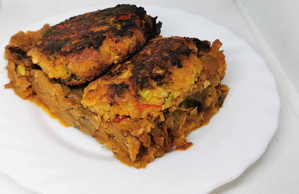 Do naczynia żaroodpornego przekładamy kapustę, na górę układamy kotlety i zapiekamy w 180C do zrumienienia kapusty i kotletów.