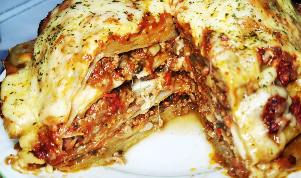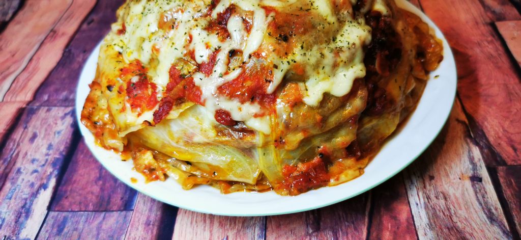 Do średniej miski wkładamy 4 sztuki liści- tak aby brzegi były przykryte, a na samym dole były min. 3 warstwy kapusty. Dodajemy część farszu, 4 plastry mozzarelli i przykrywamy kapustą. Czynności powtarzamy aż do wypełnienia miski. całość lekko dociskamy i odlewamy wodę i tłuszcz.