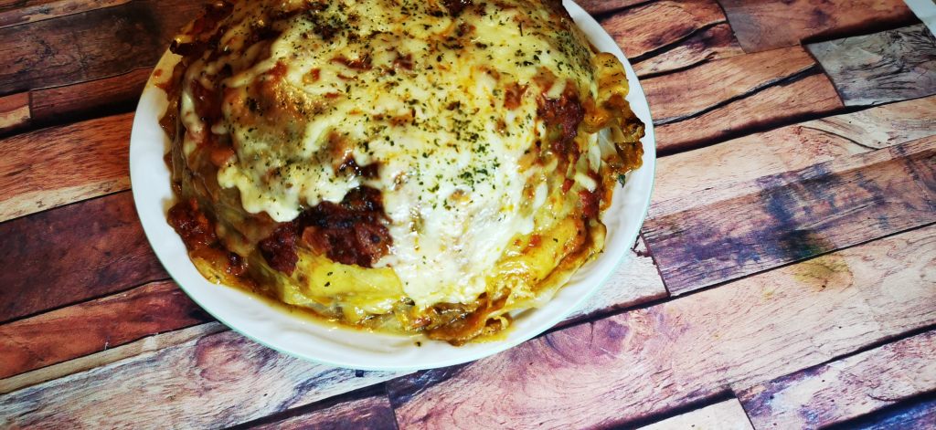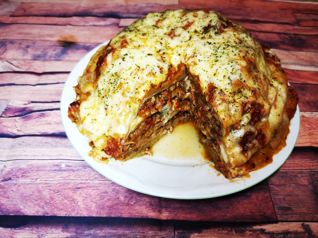 Miskę przykrywamy arkuszem papieru do pieczenia, przykrywamy blachą do pieczenia i obracamy całość. Wierzch lasagni smarujemy połową sosu.