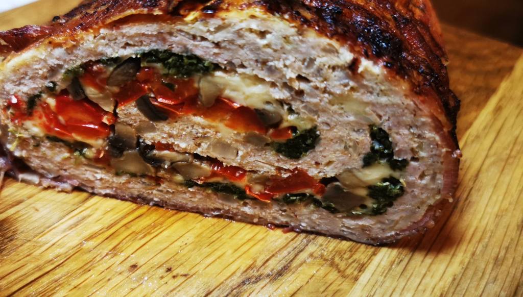Na zwilżonym olejem papierze pergaminowym rozkładamy mięso i rozprowadzamy na grubość niecałego centymetra i o zbliżonym kształcie prostokąta. Rozprowadzamy szpinak, posypujemy startym serem gouda i nakładamy farsz pieczarkowo- paprykowy.