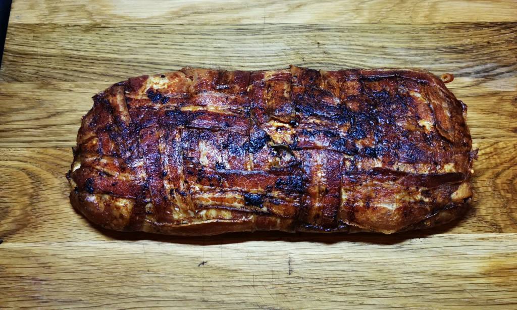 Na tym samym papierze robimy „plecionkę” z plastrów boczku na szerokość naszej rolady.