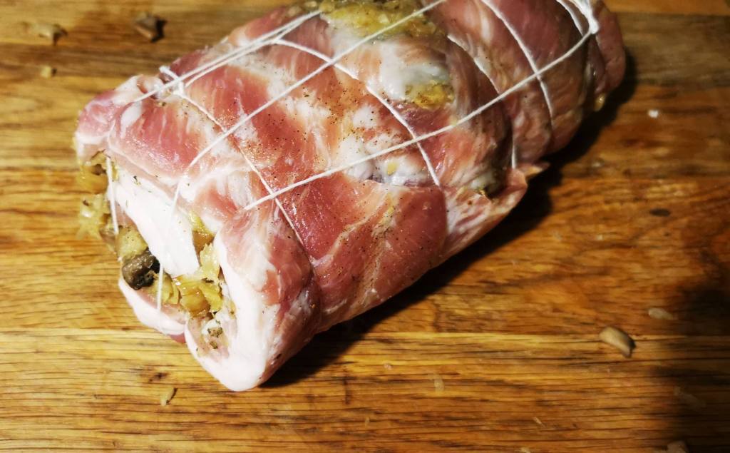 Rozwijamy boczek i rozkładamy na nim farsz. Dokładnie zawijamy i związujemy sznurkiem.