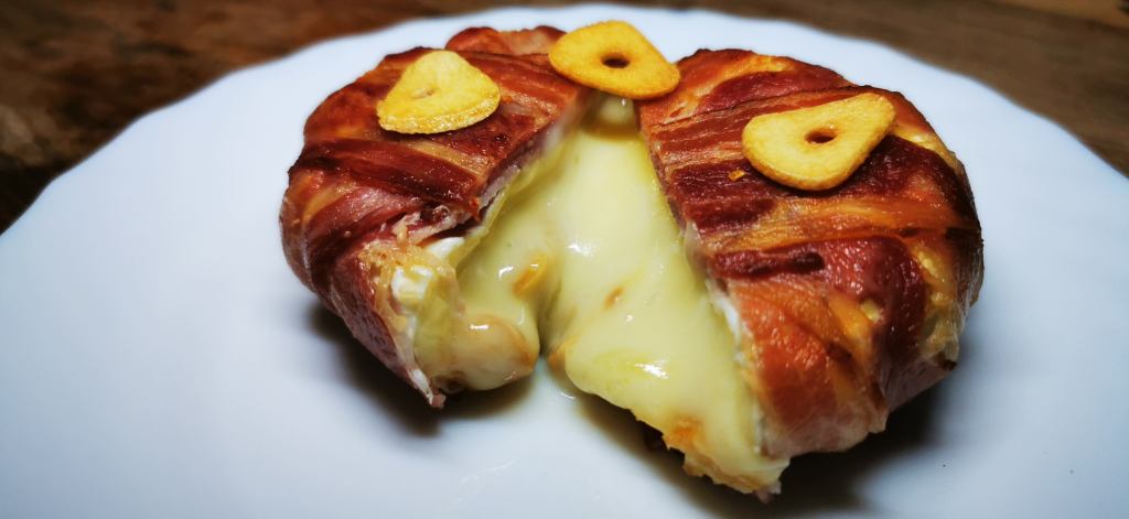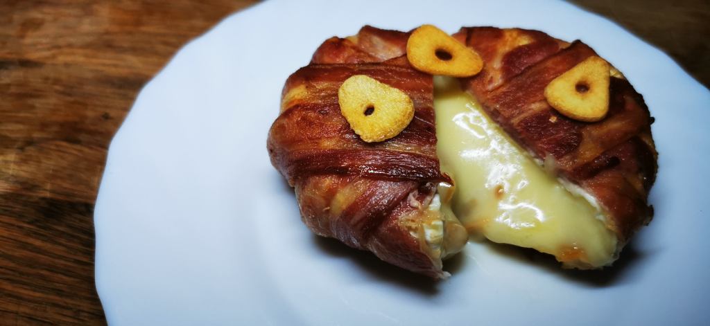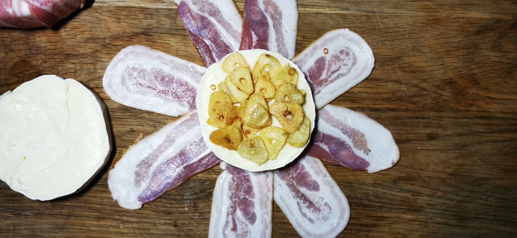 Z 4 plastrów boczku robimy „gwiazdę”, kładziemy połówkę sera, dodajemy czosnek, przykrywamy drugą połówką i dokładnie zawijamy „kanapkę” aby nie było szpar. Powtarzamy to samo z drugim serem.