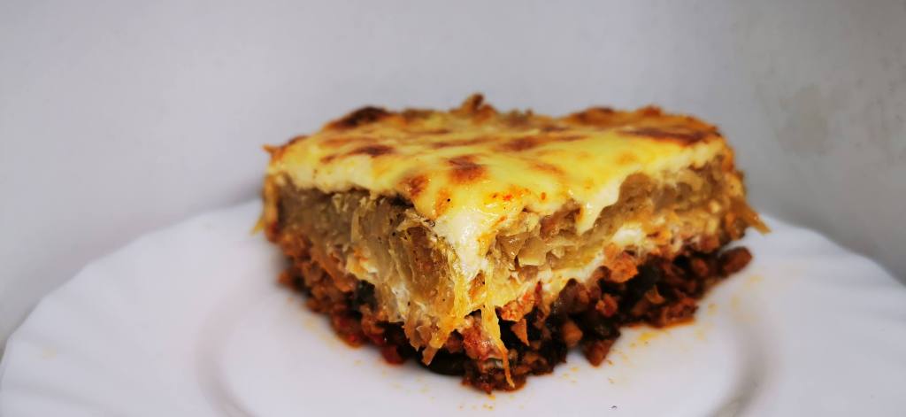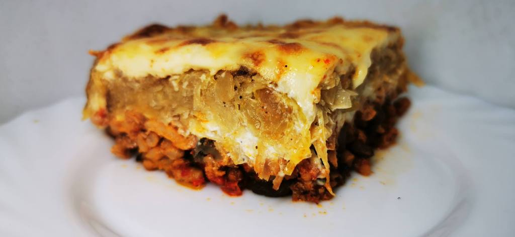 Do naczynia przekładamy farsz mięsny, polewamy połową sosu, kładziemy kapustę, resztę sosu i posypujemy serem.